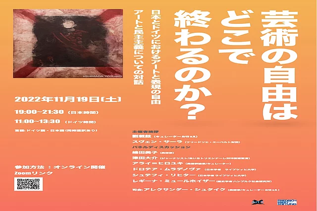 オンラインパネルディスカッション「芸術の自由はどこで終わるのか?ー日本とドイツにおけるアートと表現の自由 – アートと民主主義についての対話ー」 19.11.2022 11月19日(土)に「芸術の自由はどこで終わるのか?-日本とドイツにおけるアートと表現の自由 ーアートと民主主義についての対話ー」をテーマに、オンラインパネルディスカッションを開催いたします。 自由で民主的な基本秩序を保障するため、表現と芸術の自由は貴重な財産として守られなければなりません。政治や経済からの圧力を受けずに芸術の自由を守り、維持するにはどうしたらよいのでしょうか。パネリストたちは、日本とドイツにおけるアートプロジェクトとその可能性、また両国における制約や問題点について議論します。 日本(日本国憲法第21条)とドイツ(基本法第5条)では、表現と芸術の自由は貴重な財産とされています。自由で民主的な基本秩序を保障するためには、それを守らなければなりません。しかしながら、国家の影響力の行使から市民を護るこうした権利が十分に考慮されない、あるいは芸術作品やその著作者が、しばしば政治的な意図により制裁や検閲を受け、禁止されるといった例や現状があります。政治や経済からの圧力を受けずに芸術の自由を守り、維持するにはどうしたらよいのでしょうか。 こうした背景を踏まえて、パネリストたちは日本とドイツにおけるアートプロジェクトとその可能性、また制約や問題点についても考察し、得られた見識を今後のプロジェクトに応用できるように共通項を言語化することを試みます。 - 主催:フリードリヒ・エーベルト財団(FES)Art5 e.V. ※オンライン開催させていただきます。下記リンクより、ご自由にご参加頂けます。------------------------------------------------------------------------------- - 日時: 2022年11月19日(土)19:00~21:30(日本時間) 11:00~13:30 (ドイツ時間) - 会場:Zoomによるオンライン開催: リンク - 言語:ドイツ語・日本語(同時通訳) ------------------------------------------------------------------------------------ リンク: Art5 e.V. ホームページ Progamm Deutsch 234 KB プログラム(日本語) 453 KB パネリスト・略歴 1 MB