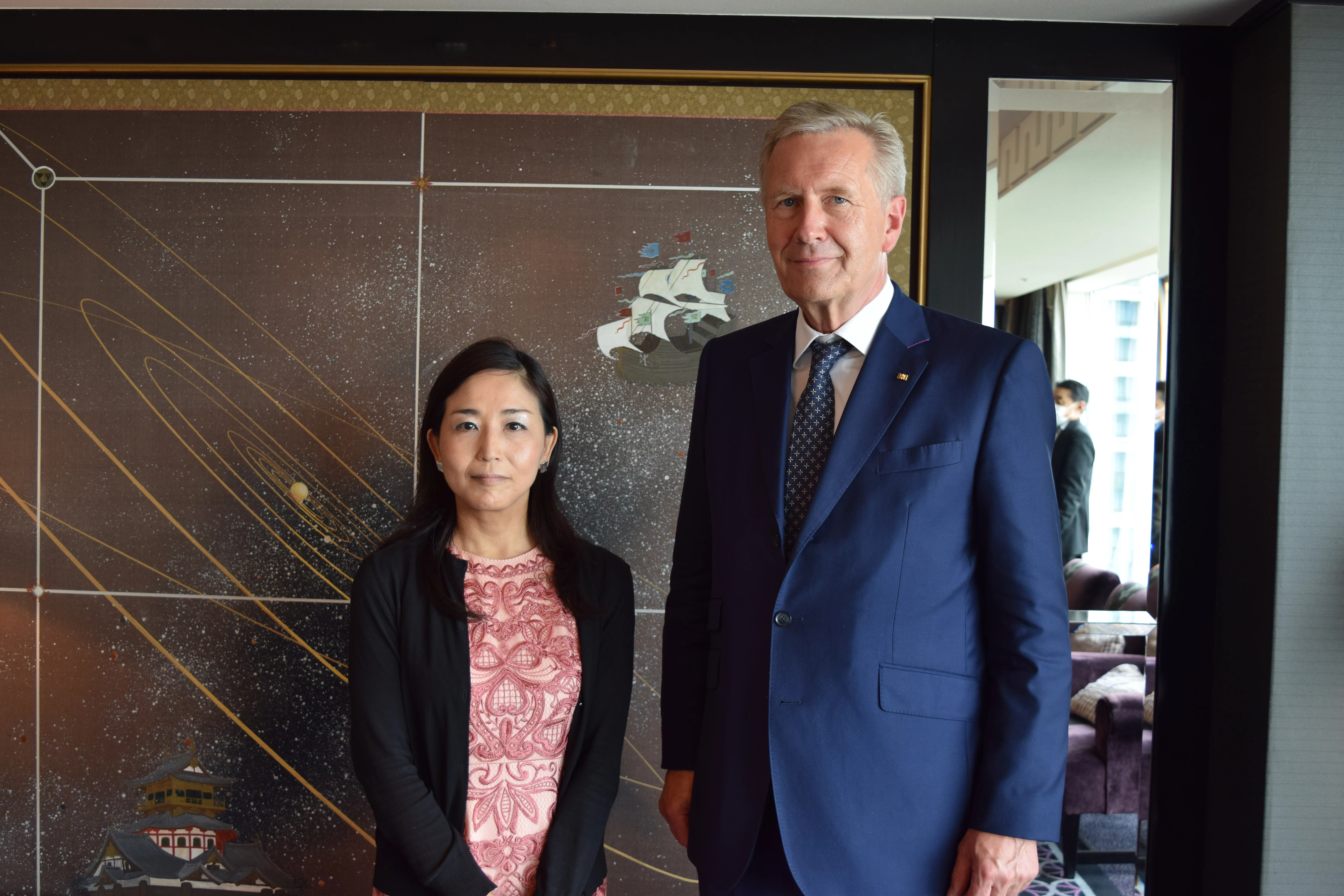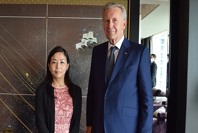 安全保障政策:日独の国際政治における展望 31.08.2022 クリスティアン・ヴルフ元連邦大統領の日本訪問では、日本の外交政策と安全保障が重要な議題とされました。ヴルフ氏はこの目的で、東京の様々なNGOの代表者と対話を行いました。 Sayo Saruta, Bundespräsident a.D. Christian Wulff Links: Sven Saaler, Toshi Winsherman, Shogo Akagawa Rechts: Bundespräsident a.D. Christian Wulff, Gunnar Michel