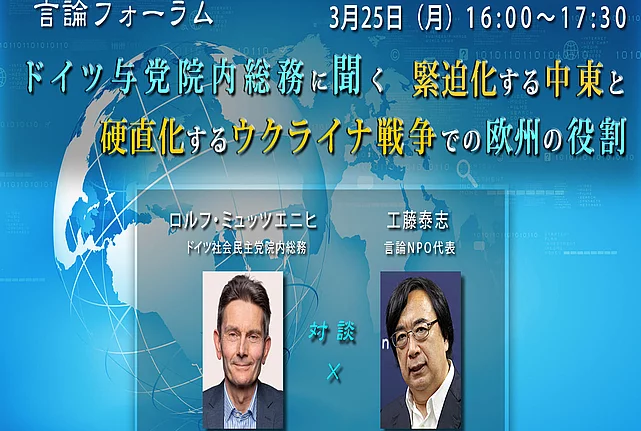 対談「ドイツ与党院内総務に聞く『緊迫化する中東と硬直化するウクライナ戦争での欧州の役割』」 25.03.2024 当初1月に来日予定だった、ドイツ与党・社会民主党の院内総務で、外交・安全保障が専門のロルフ・ミュッツエニヒ氏の訪日の日程が改めて決定しました。それに合わせて、ロルフ・ミュッツエニヒ氏と、言論NPO代表・工藤泰志氏の対談方式で、「緊迫化する中東と硬直化するウクライナ戦争での欧州の役割」について伺います。 日時: 2024年3月25日(月)16:00~17:30 言語: 独日同時通訳 会場: 言論NPO 会議室 + オンライン同時配信 参加費: 無料(要登録) 【参加登録】会場およびオンラインにてご参加の方は下記 "Related Links"のリンク先よりご登録ください。 主催: 言論NPO 共催: フリードリヒ・エーベルト財団 (FES) 参加登録リンク