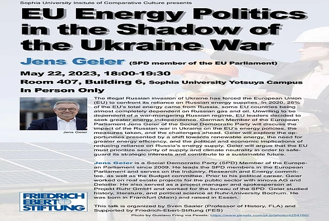 講演会「ウクライナ戦争の陰に潜むEUエネルギー政策」 22.05.2023 ロシアの違法なウクライナ侵攻により、欧州連合(EU)はロシアからのエネルギー供給に依存していた事実に直面することとなりました。2020年には、EUの総エネルギーの25%がロシアからもたらされ、一部のEU諸国はロシアのガスと石油にほぼ完全に依存しています。 独社会民主党のイェンス・ガイヤー欧州議会議員は、ロシアのウクライナ戦争がEUのエネルギー政策に与えた影響とその対策、また今後の課題について議論します。さらに、再生可能エネルギーへのシフトがもたらす展望とエネルギー効率向上の必要性、ロシアのエネルギー供給への依存度を下げることの政治的・経済的意味合いについて考察します。日時: 2023年5月22日(月) 18時30分~20時30分 言語: 英語 会場: 上智大学四谷キャンパス6号館407号(対面のみ) 主催:上智大学比較文化研究所(ICC) 共催:フリードリヒ・エーベルト財団(FES)