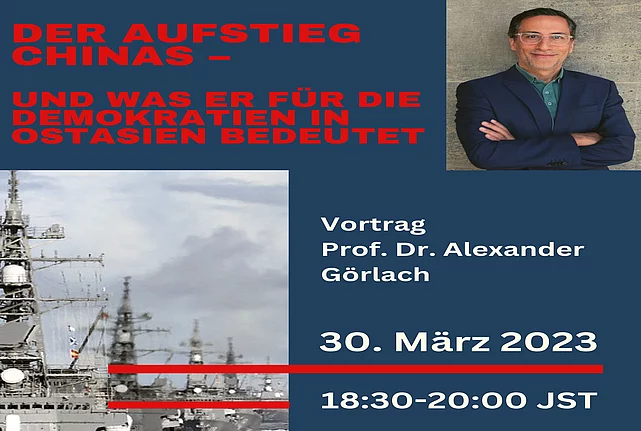講演会「中国の台頭と東アジアの民主主義国への影響」 17.03.2023 中国の台頭による、東アジアの民主主義諸国への脅威は、年々、強まってきています。とりわけ、台湾の領土権をめぐる問題は中国の民主主義に対する数々の挑発を顕著に表しています。中国の影響力拡大に対し東アジアの民主主義諸国がどのような対応を迫られているのか。本講演では、ゲルラッハ博士が東アジア地域全体の今後の地政学的な課題に対する独自の見解を紹介します。 台湾のみならず、日本や韓国も、中国が北朝鮮の支援を後ろ盾に築き上げている政治的・軍事的圧力に危機感を示しています。日韓の両国はすでに軍事防衛費を大幅に増額させ、米国との軍事同盟を強化する計画を発表しました。中国は今後、圧倒的な経済力・軍事力を駆使し、東アジアとのさらなる戦略的交渉を試みるでしょう。中国の影響力拡大に対し東アジアの民主主義諸国がどのような対応を迫られているのか。また、東アジア地域全体の今後の地政学的な課題とは何か。本講演では、このような問題について、ゲルラッハ博士が日本とドイツ双方の観点を交えた独自の見解を紹介します。 参加のお申し込みは、こちらから。 日時: 2023年3月30日(木) 午後18時30分~20時 (18時開場) 会場: ゲーテ・インスティトゥート東京、ホール(〒107-0052 東京都港区赤坂7-5-56) 言語: 日本語−ドイツ語(同時通訳) 主催: フリードリヒ・エーベルト財団(FES)、ゲーテ・インスティトゥート東京 (Goethe-Institut Tokyo) プログラム(ドイツ語) 530 KB プログラム(日本語) 378 KB