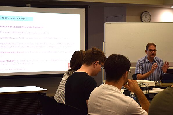 東京事務所代表のサーラ・スヴェンが、日本の政治制度や最新の動向について説明を行いました。その後の質疑応答では、直近の参議院議員選挙や新首相選出をめぐる動き、さらにはインフレや賃金停滞、ジェンダー平等といった社会課題をテーマに、活発な議論が交わされました。