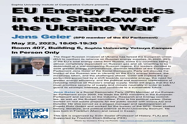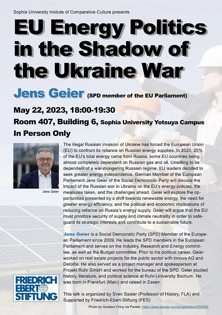 Lecture: EU Energy Politics in the Shadow of the Ukraine War 22.05.2023 The illegal Russian invasion of Ukraine has forced the European Union (EU) to confront its reliance on Russian energy supplies. In 2020, 25% of the EU’s total energy came from Russia, some EU countries being almost completely dependent on Russian gas and oil. German Member of the European Parliament Jens Geier of the Social Democratic Party will discuss the impact of the Russian war in Ukraine on the EU’s energy policies, the measures taken, and the challenges ahead. Geier will explore the opportunities presented by a shift towards renewable energy, the need for greater energy efficiency, and the political and economic implications of reducing reliance on Russia’s energy supply.Die illegale russische Invasion hat die Europäische Union (EU) gezwungen, sich mit ihrer Abhängigkeit von den russischen Energielieferungen auseinanderzusetzen. Im Jahr 2020 stammten 25 % des gesamten Energiebedarfs der EU aus Russland, wobei einige EU-Länder fast vollständig von russischem Gas und Öl abhängig waren. Der deutsche Europaabgeordnete Jens Geier von der Sozialdemokratischen Partei wird über die Auswirkungen des russischen Krieges in der Ukraine auf die Energiepolitik der EU sprechen.Date: Monday, 22nd May 2023 Time: 18:00-19:30 Language: English Venue: Room 407, Building 6, Sophia University Yotsuya Campus In Person Only Organized by Sven Saaler (Professor of History, FLA) Sophia University Institute of Comparative Culture and supported by Friedrich-Ebert-Stiftung (FES)