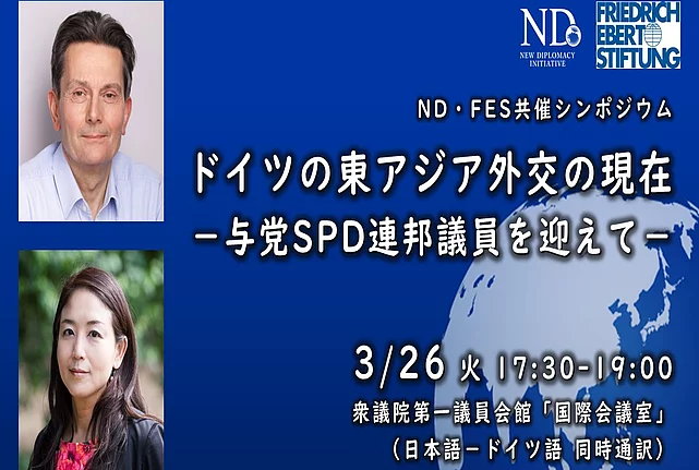 Symposium "Deutschlands Außenpolitik und Krisenherde der Weltpolitik: Ukraine, Naher Osten, Ostasien“ (Germany's foreign policy and trouble spots in world politics: Ukraine, Middle East, East Asia) 26.03.2024 Deutschland erweiterte kürzlich seinen sicherheitspolitischen Fokus auf Ostasien, basierend auf den 2020 formulierten „Indo-Pazifik-Leitlinien“ der Bundesregierung. Die Beziehungen zu Japan wurden durch das erste gemeinsame Außen- und Verteidigungsministertreffen im April 2021 und gemeinsame militärische Übungen gestärkt. 2023 wurden die deutsch-japanischen Regierungskonsultationen etabliert, und im Januar dieses Jahres wurde ein Abkommen über die gegenseitige Bereitstellung von Gütern und Dienstleistungen zwischen den Streitkräften beider Länder unterzeichnet. Die Beziehungen zwischen Deutschland und China zielten beim siebten Regierungsdialog im Juni 2023 auf die Vertiefung wirtschaftlicher Beziehungen und Klimaschutzkooperation ab. Doch betonte die erstmals im Juli 2023 verabschiedete "Chine-Strategie" der Bundesregierung auch die Notwendigkeit des „De-Risking“. Auf dieser Veranstaltungen diskutieren der Bundestagsabgeordnete und SPD-Fraktionsvorsitzende Rolf Mützenich und japanische Abgeordnete sowie Sayo Saruta (New Diplomacy Initiative) Deutschlands und Japans Außenpolitik, die deutsche bzw. japanische Einschätzung der aktuellen Lage in der Weltpolitik, und Möglichkeiten der japanisch-deutschen Kooperation. Datum: 26. März 2024 (Dienstag), 17:30 bis 19:00 Uhr Sprache: Simultanübersetzung Deutsch-Japanisch Ort: Internationaler Konferenzraum, Erstes Abgeordnetenhausgebäude des Unterhauses (Shûgi’in Dai‘ichi Gi‘in Kaikan / 2-2-1 Nagatacho, Chiyoda-ku, Tokio) Einlass: ab 17 Uhr am Haupteingang des Ersten Abgeordnetengebäudes (hier erhalten Sie eine Einlasskarte) Teilnahmegebühr: Kostenlos, begrenzt auf die ersten 100 Personen (Anmeldung erforderlich) Teilnehmerregistrierung Für die Teilnahme vor Ort registrieren Sie sich bitte über den unten stehenden "Related Links". Veranstalter: New Diplomacy Initiative (ND) Ko-Veranstalter: Friedrich-Ebert-Stiftung (FES) Registrierungslink für die Teilnahme vor Ort New Diplomacy Initiative (Homepage)
